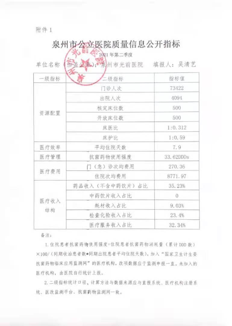 泉州市公立医院质量信息公开指标(第二季度)